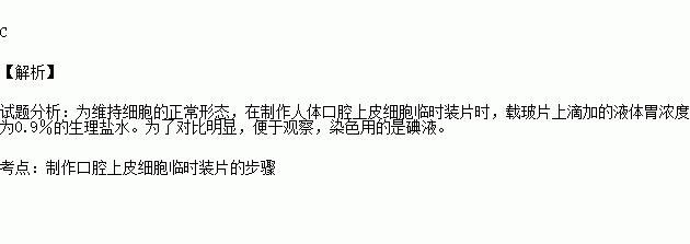 A.生理盐水、清水B.清水、生理盐水 C.生理盐水、碘液 D.清水、碘液