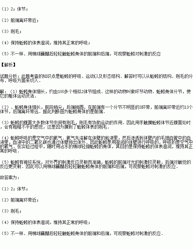 (4)在实验中要不断用浸湿的棉球轻擦蚯蚓体表,这样做是为了 .