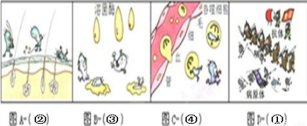 下面四幅漫画寓意的是人体免疫的三道防线,请分析图片并回答下列问题: