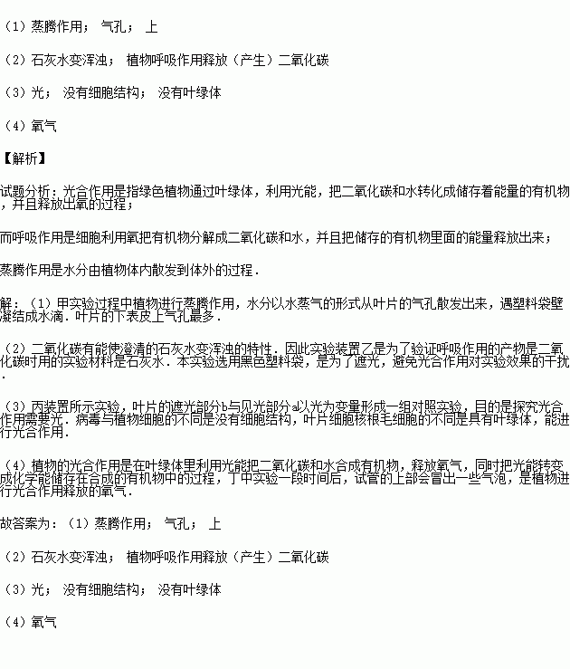 (1)甲装置进行一段时间实验后,塑料袋内壁出现的水珠主要来自植物 ,水分是通过叶片上的 散失的,叶片上散失水分的这一结构主要分布在叶片的 表皮.