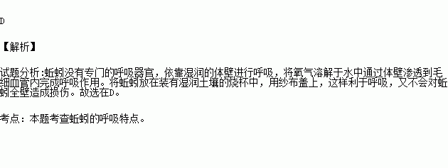 D. 将蚯蚓放在装有湿润土壤的烧杯中,用纱布盖上