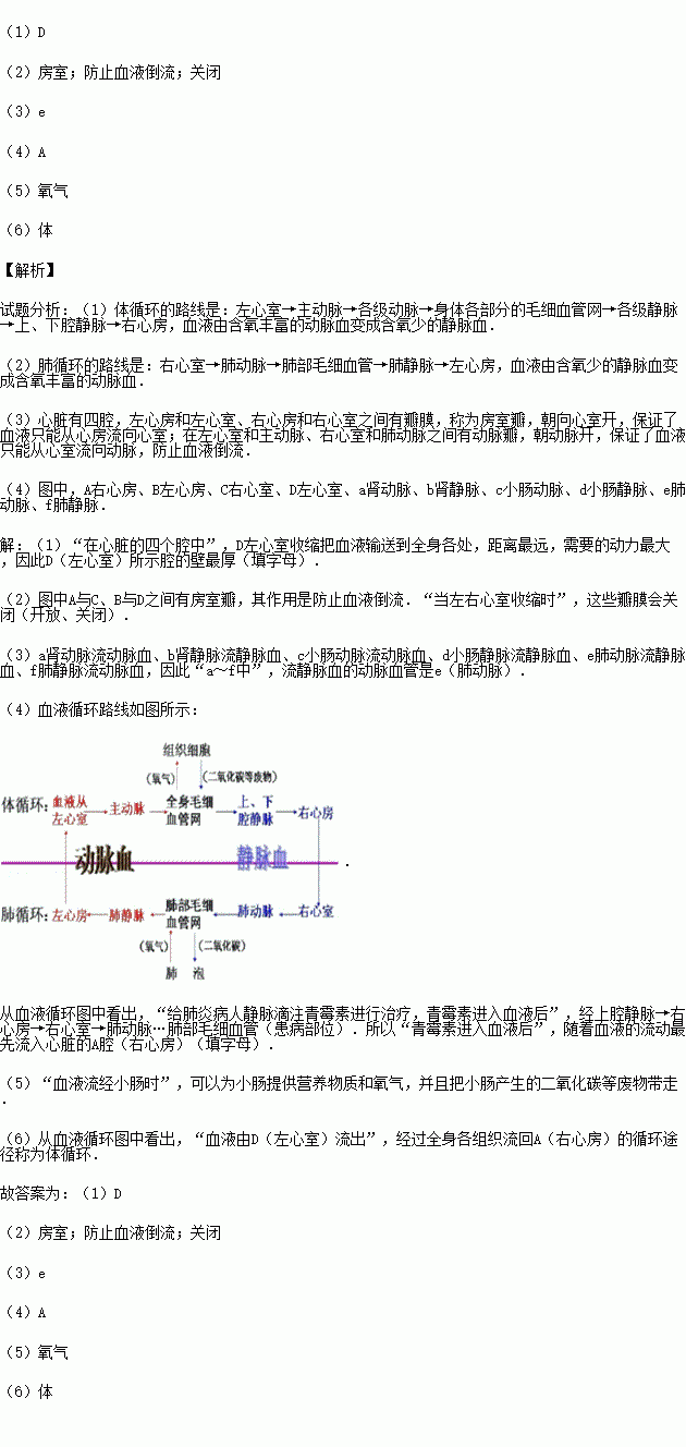 ÈçͼÊÇÈËÌåѪҺѻ·Ä£Ê½Í¼£¬A¡¢B¡¢C¡¢D·Ö±ð´ú±íÐÄÔàµÄËĸöÇ»£¬a¡«f´ú±íѪ¹Ü£¬¼ýÍ·´ú±íѪҺÁ÷¶¯µÄ·½Ïò£¬Çë»Ø´ð£º