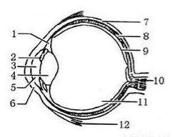 眼球壁包括外膜(6角膜和7巩膜)、中膜(2虹膜、1睫状体、8脉络膜)、内膜(9视网膜)三部分.角膜是无色透明的,里面有丰富的感觉神经末梢;巩膜白色、坚韧,保护眼球;虹膜能够调节瞳孔的大小,里面有色素,东方人的“黑眼球”和西方人的“蓝眼睛”就是它的颜色;睫状体能够调节4晶状体的曲度,使人看远近不同的物体,相当于照相机上的镜头;脉络膜里有血管和黑色素,营养眼球并起暗箱的作用;视网膜上有感光细胞,可以接受物像的刺激并产生神经冲动.内容物包括5房水、4晶状体和11玻璃体,在物像的形成过程中,对光线起折射作用.