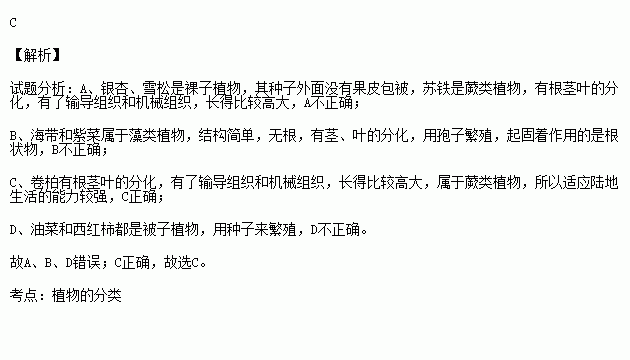 A.银杏、苏铁和雪松是裸子植物,其种子外面均有果皮包被