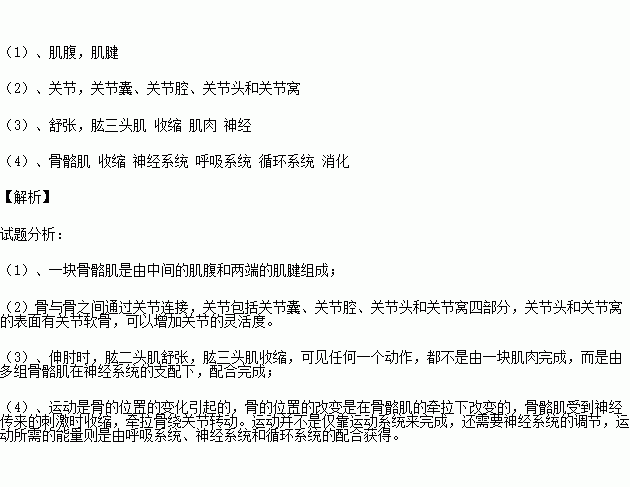 (4)骨的运动要靠 的牵拉。骨骼肌受神经传来的刺激 时,就会牵动骨绕关节活动,于是躯体的相应部位就会产生运动。运动并不是仅靠运动系统来完成,还需要 的调节。运动所需的能量,有赖于 、 、 的配合。