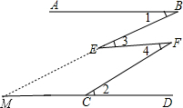 分析:延长BE交直线CD于M,根据平行线性质求出∠1=∠BMC=∠2推出BE∥CF,根据平行线性质推出即可.