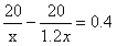 今年以来受各种因素的影响,猪肉的市场价格仍在不断上升。据调查,今年5月份一级猪肉的价格是1月份一级猪肉价格的1. 25倍,小英同学的妈妈同样用20元钱在5月份购得一级猪肉比在1月份购得的一级猪肉少0.4斤,那么今年1月份的一级猪肉每斤是多少元?