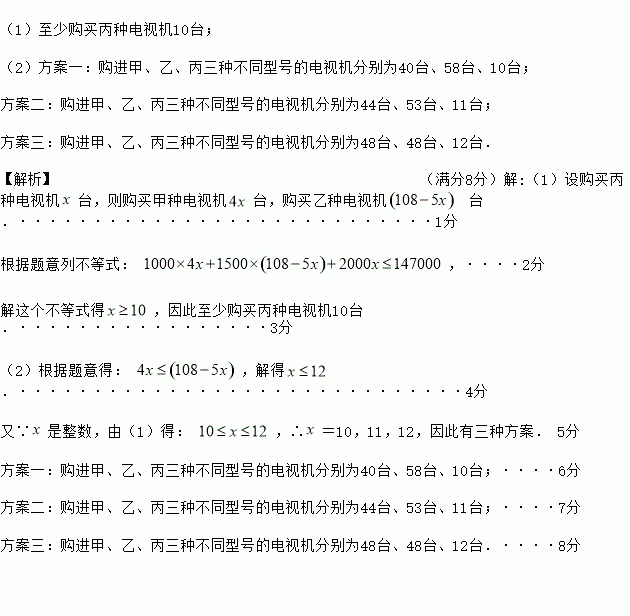 ijÉ̳¡Îª×öºÃ¡°¼ÒµçÏÂÏ硱µÄ»ÝÃñ·þÎñ£¬¾ö¶¨´Ó³§¼Ò¹º½ø¼×¡¢ÒÒ¡¢±ûÈýÖÖ²»Í¬ÐͺŵĵçÊÓ»ú108̨£¬ÆäÖм×ÖÖµçÊÓ»úµĄ̈ÊýÊDZûÖÖµÄ4±¶£¬¹º½øÈýÖÖµçÊÓ»úµÄ×ܽð¶î²»³¬¹ý147 000Ôª£¬ÒÑÖª¼×¡¢ÒÒ¡¢±ûÈýÖÖÐͺŵĵçÊÓ»úµÄ³ö³§¼Û¸ñ·Ö±ðΪ1 000Ôª/̨£¬1 500Ôª/̨£¬2 000Ôª/̨£®