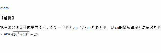 如图是一个三级台阶,它的每一级的长、宽、高分别为20dm、3dm、2dm.A和B是这个台阶上两个相对的端点,点A处有一只蚂蚁,想到点B处去吃可口的食物,则蚂蚁沿着台阶面爬行到点B的最短路程为 dm.