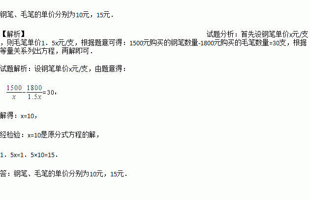 某校举行书法比赛,为奖励优胜学生,购买了一些钢笔和毛笔,毛笔单价是钢笔单价的1.5倍,购买钢笔用了1500元,购买毛笔用了1800元,购买的钢笔支数比毛笔多30支,钢笔、毛笔的单价分别为多少元?