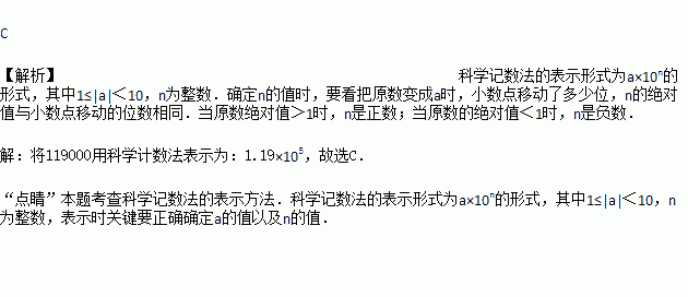 2016年10月12日至15日,第二届中国“互联网+”大学生创新创业全国总决赛上,ofo共享单车从全国约119000个创业项目中脱颖而出,最终获得金奖. 将119000用科学计数法表示应为