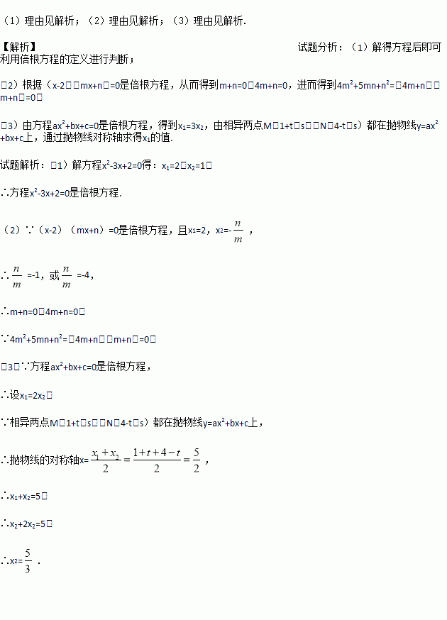 (3)如果方程ax2+bx+c=0是倍根方程,且相异两点M(1+t,s),N(4-t,s)都在抛物线y=ax2+bx+c上,试说明方程ax2+bx+c=0的一个根为