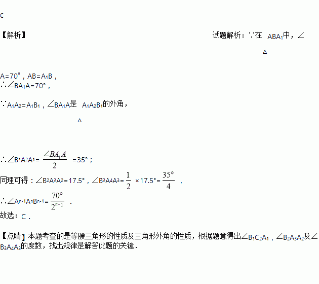 如右图,已知AB=A1B,A1B1=A1A2,A2B2=A2A3,A3B3=A3A4…,若∠A=70°,则∠An-1AnBn-1(n>2)的度数为( )