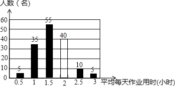 解答 解:(1)平均每天作业时间是2小时的人数是:150-5-35-55-10-5=40(人),