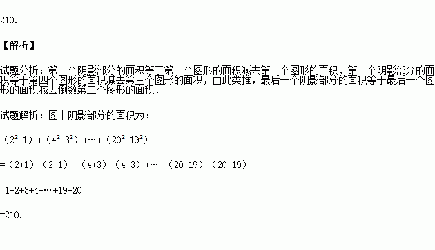 如图,将边长分别为1、2、3、4……19、20的正方形置于直角坐标系第一象限,如图中方式叠放,则按图示规律排列的所有阴影部分的面积之和为 .