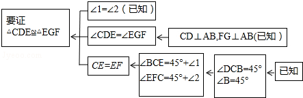 如图:已知在Rt△ABC中,AC=BC,∠ACB=90°,CD⊥AB于点D,点E、F分别在AB和BC上,∠1=∠2,FG⊥AB于点G,求证:△CDE≌△EGF.