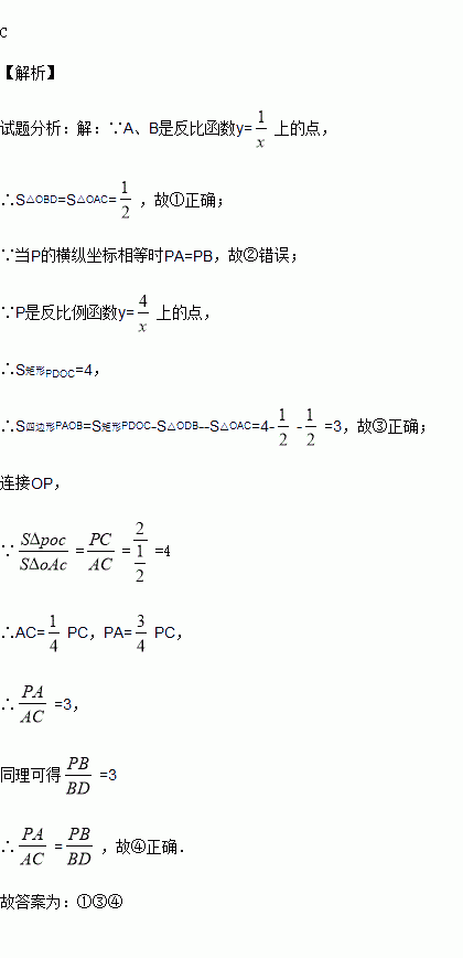的图象于点B。.下面结论:①△ODB与△OCA的面积相等;②PA与PB始终相等;③四边形PAOB的面积大小不会发生变化;④CA=