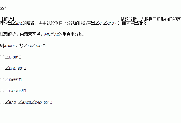 AC的长为半径画弧,两弧相交于点M,N,作直线MN,交BC于点D,连接AD,求∠BAD的度数.