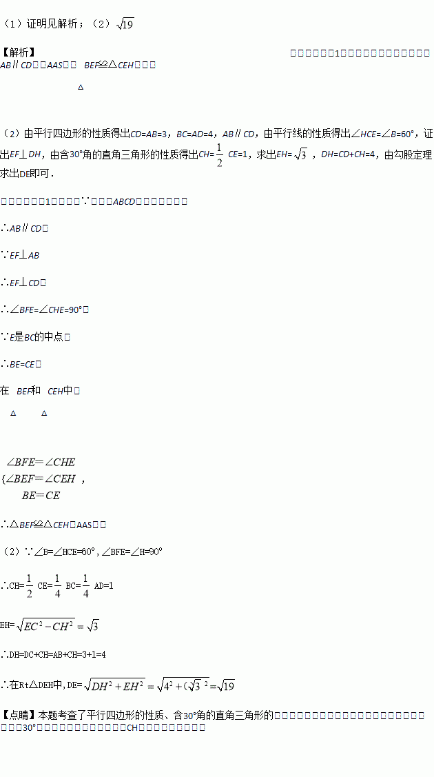 如图,在□ABCD中,AB=3,AD=4,∠ABC=60°,过BC的中点E作EF⊥AB于F,与DC的延长线相交于点H.