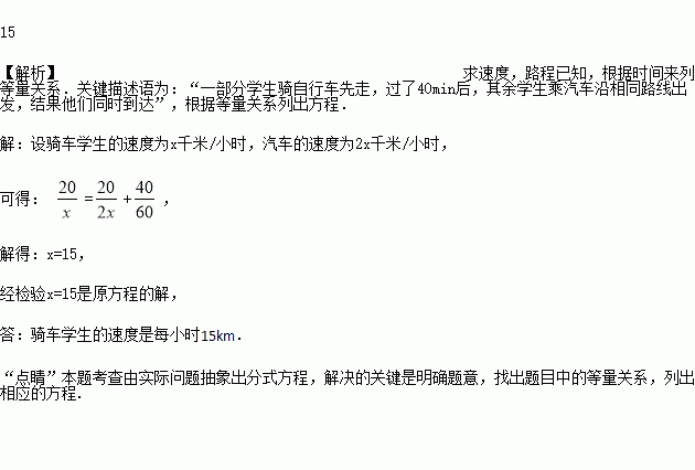 某校学生利用双休时间去距学校20km的白水寺参观,一部分学生骑自行车先走,过了40min后,其余学生乘汽车沿相同路线出发,结果他们同时到达.已知汽车的速度是骑车学生速度的2倍,骑车学生的速度是_____________Km/h.
