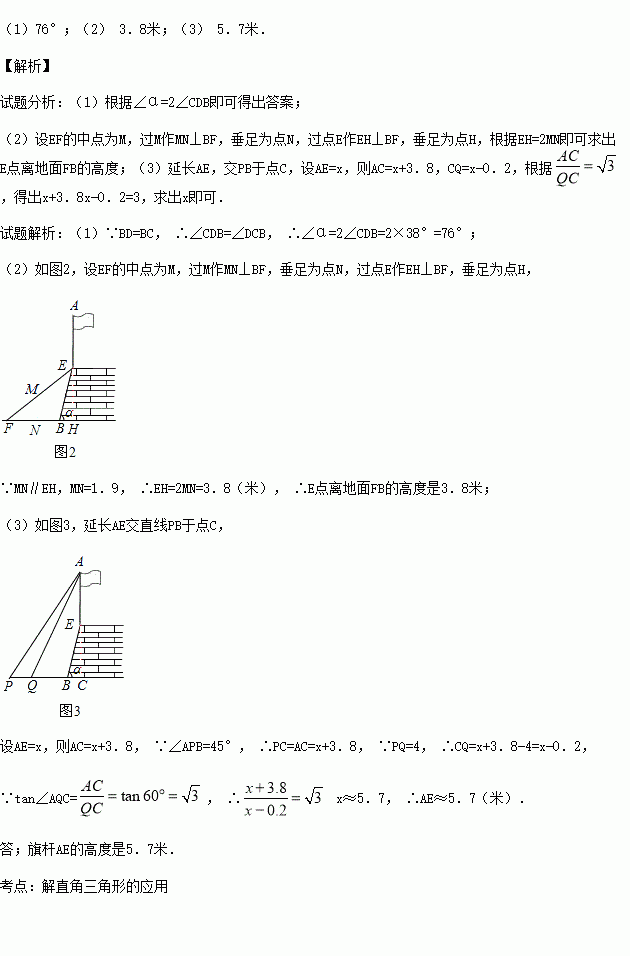 (3)如图3,第三小组利用第一、二小组的结果,来测量护墙上旗杆的高度.在点P测得旗杆顶端A的仰角为45°,向前走4米到达Q点,测得A的仰角为60 °,求旗杆AE的高度(精确到0.1米).