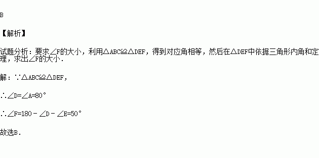 (2015秋•东平县期末)已知△ABC≌△DEF,∠A=80°,∠E=50°,则∠F的度数为( )