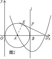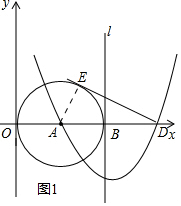 (2)由于DE是⊙A的切线,连接AE,那么根据切线的性质知AE⊥DE,在Rt△AED中,AE、AB是圆的半径,即AE=OA=AB=4,而A、D关于抛物线的对称轴对称,即AB=BD=4,由此可得到AD的长,进而可利用勾股定理求得切线DE的长;