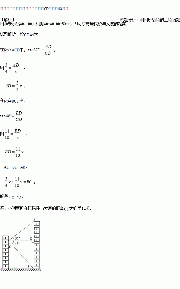 小明家所在居民楼的对面有一座大厦AB,AB=80米,为测量这座居民楼与大厦之间的距离,小明从自己家的窗户C处测得大厦顶部A的仰角为37°,大厦底部B的俯角为48°.求小明家所在居民楼与大厦的距离CD的长度.(结果保留整数)