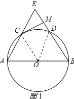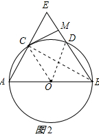 分析 (1)由半圆的三等分点,得$\widehat{AC}$=$\widehat{CD}$=$\widehat{DB}$,连接OC、OD,则∠AOC=∠COD=∠DOB=60°,证得△AOC、△DOB为正三角形,得出∠EAB=∠EBA=60°,即可得出结果;(2)连接BC,由$\frac{EM}{CE}$=$\frac{CE}{EB}$,∠E=∠E,证得△CEM∽△BEC,由AB为⊙O的直径,得出∠ACB=90°,∠ECB=90°,由△CEM∽△BEC得出∠EMC=∠ECB=90°,由∠AOC=∠DOB=60°,证得OC∥BE,证得∠OCM=90°,即可得出结论.