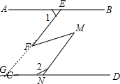 分析:延长EF交直线CD于G,根据平行线的性质得出∠1=∠EGD,求出∠EGD+∠2=180°,根据平行线的判定得出EF∥MN,根据平行线的性质得出即可.