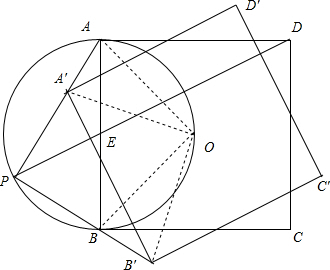 分析 连接OA,OA′,OB,OB′,根据正方形的性质得到OA=OB,OA′=OB′,∠AOB=∠A′0B′=90°,求得∠AOA′=∠BOB′,推出△OAA′≌△OBB′,得到∠OAA′=∠OBB′,求得∠APB=90°,即点P在以AB为直径的圆上,结论DE并延长交⊙E于P,此时PD最大,根据勾股定理求得结果.