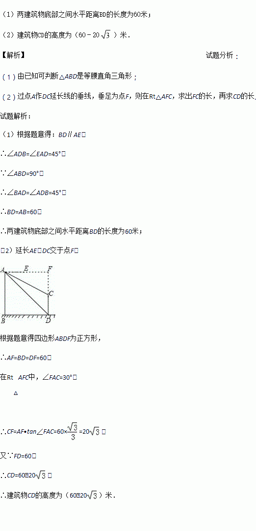 如图,AB、CD为两个建筑物,建筑物AB的高度为60米,从建筑物AB的顶点A点测得建筑物CD的顶点C点的俯角∠EAC为30°,测得建筑物CD的底部D点的俯角∠EAD为45°.