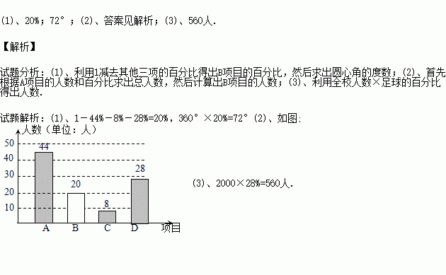 (1)求样本中最喜欢B项目的人数百分比和其所在扇形图中的圆心角的度数;