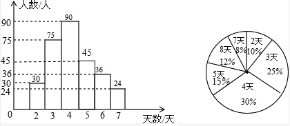 (2)参加社会实践活动5天的人数是:300-30-75-90-36-24=45(人),