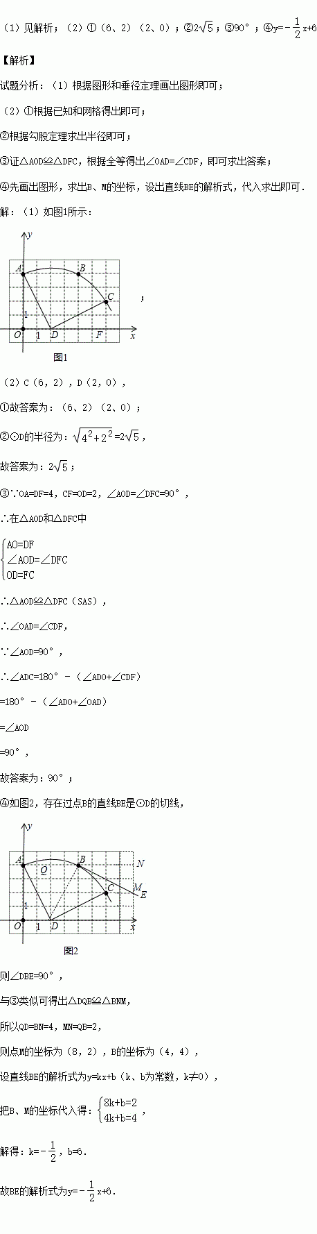 (1)请完成如下操作:①以点O为原点、竖直和水平方向为轴、网格边长为单位长,建立平面直角坐标系;②根据图形提供的信息,标出该圆弧所在圆的圆心D,并连接AD、CD.