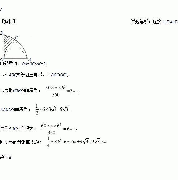 如图,在扇形AOB中,∠AOB=90°,以点A为圆心,OA的长为半径作弧OC交弧AB于点C,若OA=6,则阴影部分的面积为( )
