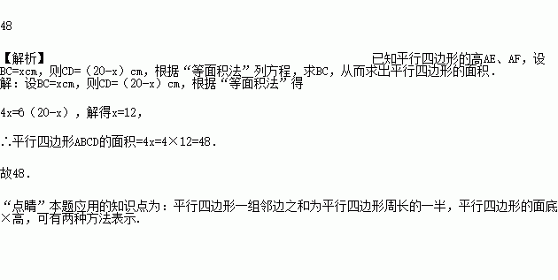 如图,在平行四边形ABCD中,AE⊥BC于E,AF⊥CD于F,若AE=4,AF=6,平行四边形ABCD的周长为40.则平行四边形ABCD的面积为(______).