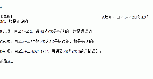 C. 若∠A=∠3,则 AD∥BC D. 若∠A+∠ADC=180°,则AD∥BC
