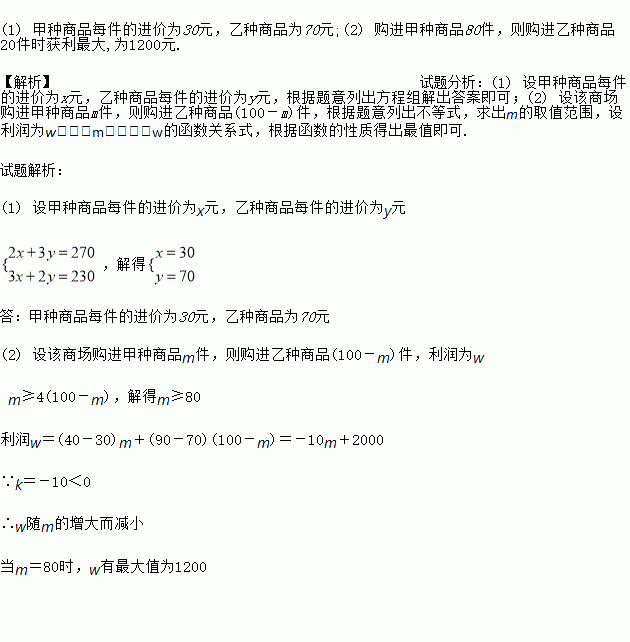 ´º½ÚÆÚ¼ä£¬Ä³É̳¡¼Æ»®¹º½ø¼×¡¢ÒÒÁ½ÖÖÉÌÆ·£¬ÒÑÖª¹º½ø¼×ÉÌÆ·2¼þºÍÒÒÉÌÆ·3¼þ¹²Ðè270Ôª£»¹º½ø¼×ÉÌÆ·3¼þºÍÒÒÉÌÆ·2¼þ¹²Ðè230Ôª