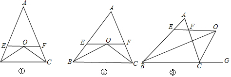 ·ÖÎö £¨1£©ÓÉAB=AC£¬¿ÉµÃ¡ÏABC=¡ÏACB£»ÓÖÒÑÖªOB¡¢OC·Ö±ðƽ·Ö¡ÏABC¡¢¡ÏACB£»¹Ê¡ÏEBO=¡ÏOBC=¡ÏFCO=¡ÏOCB£»¸ù¾ÝEF¡ÎBC£¬¿ÉµÃ£º¡ÏOEB=¡ÏOBC=¡ÏEBO£¬¡ÏFOC=¡ÏFCO=¡ÏBCO£»Óɴ˿ɵóöµÄµÈÑüÈý½ÇÐÎÓУº¡÷AEF¡¢¡÷OEB¡¢¡÷OFC¡¢¡÷OBC¡¢¡÷ABC£»ÒÑÖªÁË¡÷EOBºÍ¡÷FOCÊǵÈÑüÈý½ÇÐΣ¬ÔòEO=BE£¬OF=FC£¬ÔòEF=BE+FC£®