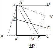 (2)按(1)的思路也要通过构建全等三角形来求解,可过点A作AM∥HF交BC于点M,过点A作AN∥EG交CD于点N,将△AND绕点A旋转到△APB,不难得出△APM和△ANM全等,那么可得出PM=MN,而MB的长可在直角三角形ABM中根据AB和AM(即HF的长)求出.如果设DN=x,那么NM=PM=BM+x,MC=BC-BM=1-BM,因此可在直角三角形MNC中用勾股定理求出DN的长,进而可在直角三角形AND中求出AN即EG的长.