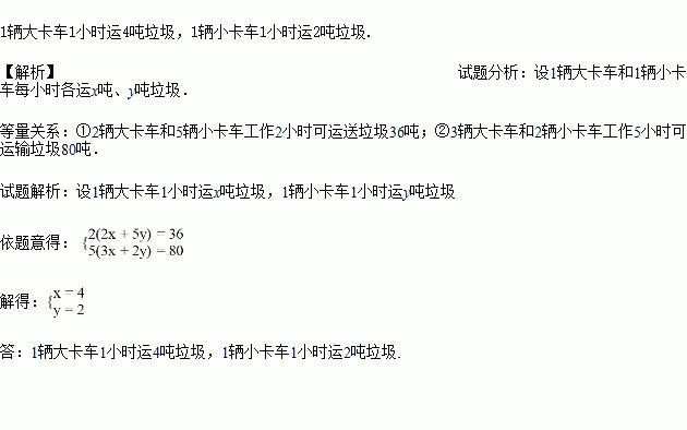 2辆大卡车和5辆小卡车工作2小时可运送垃圾36吨,3辆大卡车和2辆小卡车工作5小时可运输垃圾80吨,那么1辆大卡车和1辆小卡车1小时各运多少吨垃圾?