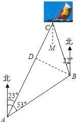 过点C做正北方向的平行线CM,则∠ACM=23°,∠BCM=22°,