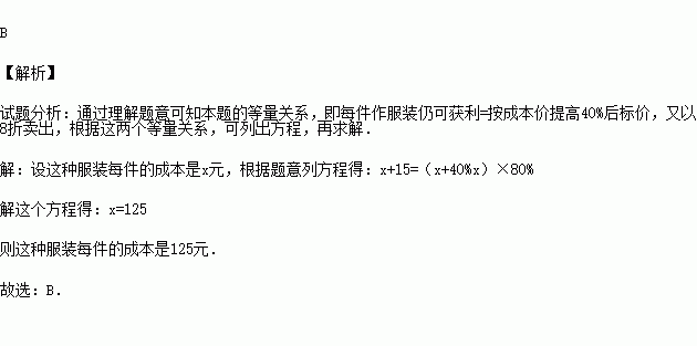 (2002•荆州)一家商店将某种服装按成本价提高40%后标价,又以8折(即按标价的80%)优惠卖出,结果每件作服装仍可获利15元,则这种服装每件的成本是( )