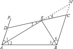 (2)此题要通过构造全等三角形来求解,延长AE交BC的延长线于M;由AP∥BC,及AE平分∠PAB,可求得∠BAE=∠M,即AB=BM,因此直线证得AD=MC即可;在等腰△ABM中,BE是顶角的平分线,根据等腰三角形三线合一的性质知:E是AM的中点,即AE=EM,而PA∥BM,即可证得△ADE≌△MCE,从而得到所求的结论.