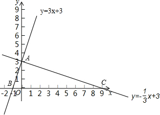 分析 先根据坐标轴上点的坐标特征求出A(0,3),B(-1,0),C(9,0),再利用两点间的距离公式分别计算出AB2=10,AC2=90,BC2=100,然后根据勾股定理的逆定理得到△BAC为直角三角形,∠BAC=90°,于是可判断直线y=3x+3与直线y=-$\frac{1}{3}$x+3垂直.