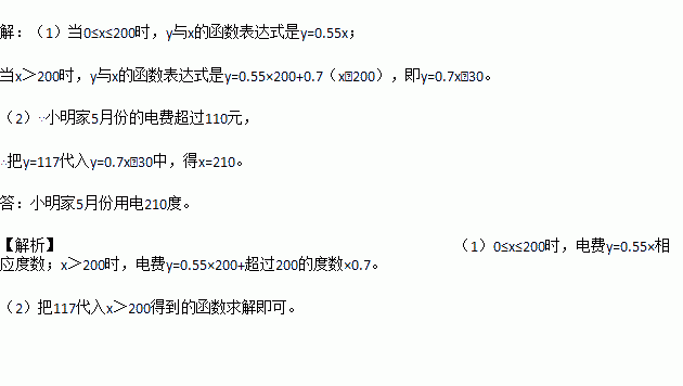 某市为了鼓励居民节约用电,采用分段计费的方法按月计算每户家庭的电费.月用电量不超过200度时,按0.55元/度计费;月用电量超过200度时,其中的200度仍按0.55元/度计费,超过部分按0.70元/度计费.设每户家庭月用电量为x度时,应交电费y元.