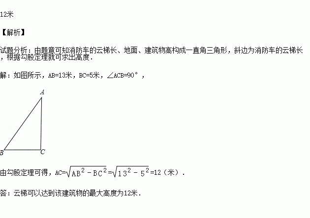 (2015秋•甘谷县期末)一座建筑物发生了火灾,消防车到达现场后,发现最多只能靠近建筑物底端5米,消防车的云梯最大升长为13米,求云梯可以达到该建筑物的最大高度.