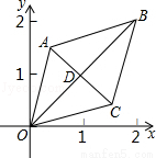 如图,已知菱形OABC的顶点O(0,0),B(2,2),若菱形绕点O逆时针旋转,每秒旋转45°,则 第60秒时,菱形的对角线交点D的坐标为