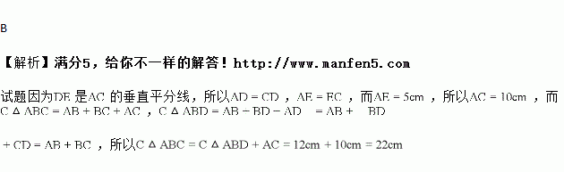 如图,△ABC中,D为BC上一点,△ABD的周长为12cm,DE是线段AC的垂直平分线,AE=5cm,则△ABC的周长是( )